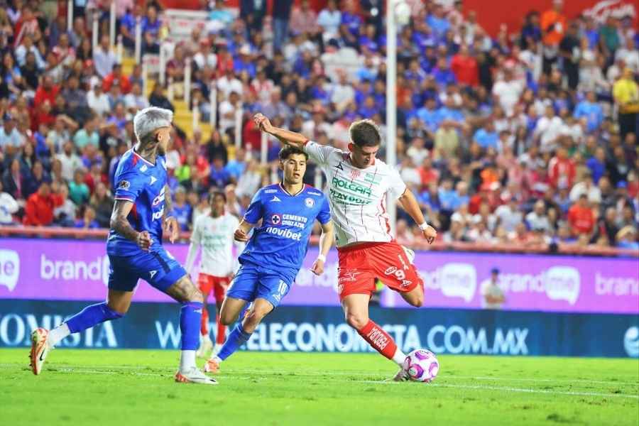 Aunque el partido parecía inclinado para los celestes, el trámite fue mucho más parejo. “Los Cementeros” controlaron la pelota en los primeros minutos. Pero Necaxa fue más peligroso al frente. Agustín Palavecino tuvo la primera gran oportunidad tras un error en la salida cementera; aunque su disparo fue detenido por el colombiano Kevin Mier.