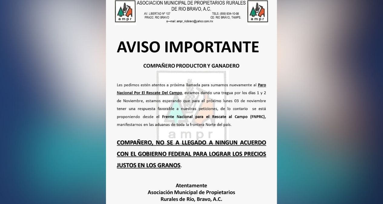 Productores y ganaderos podrían tomar las aduanas de la frontera norte si el Gobierno Federal sigue sin atender sus demandas de pagar precios justos por el sorgo y el maíz en Matamoros. Así lo advirtieron la Asociación Municipal de Propietarios Rurales de Río Bravo, A.C. La organización pidió a los agricultores mantenerse alerta ante una posible reactivación del Paro Nacional por el Rescate del Campo.