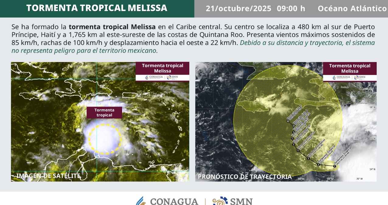 Se formó esta mañana la #TormentaTropical #Melissa en el #MarCaribe. Se localiza a 480 km al sur de Puerto Príncipe, Haití. No representa riesgo para #México pic.twitter.com/nGotreDQsc