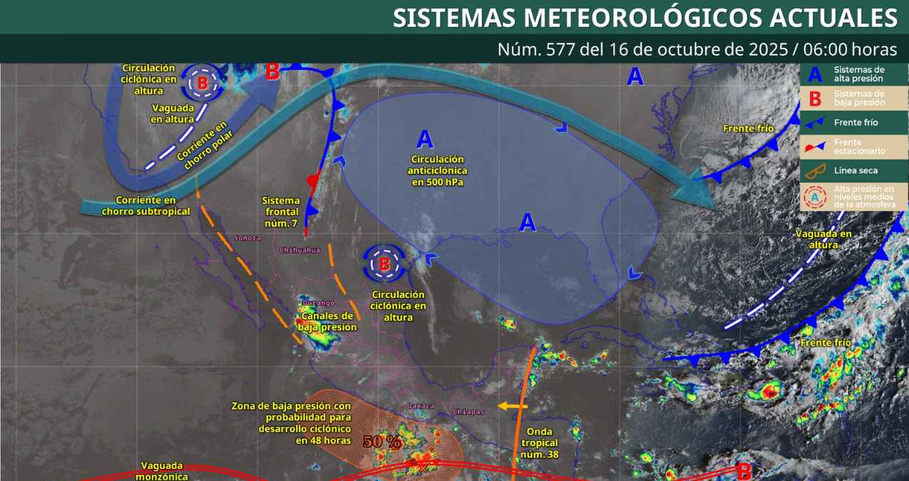 Además, una zona de baja presión con probabilidad de desarrollo ciclónico frente a las costas del Pacífico sur mantendrá la posibilidad de lluvias intensas en Oaxaca y Chiapas, y muy fuertes en Guerrero. También de oleaje elevado en las costas de estos estados.