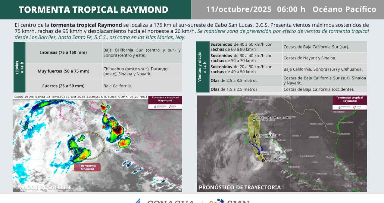 Las autoridades informaron que Raymond podría tocar tierra durante el transcurso del día, principalmente entre las zonas de Los Barriles y Santa Fe, Baja California Sur, sin descartar afectaciones en Sonora, Sinaloa, Nayarit y Durango debido a lluvias intensas.