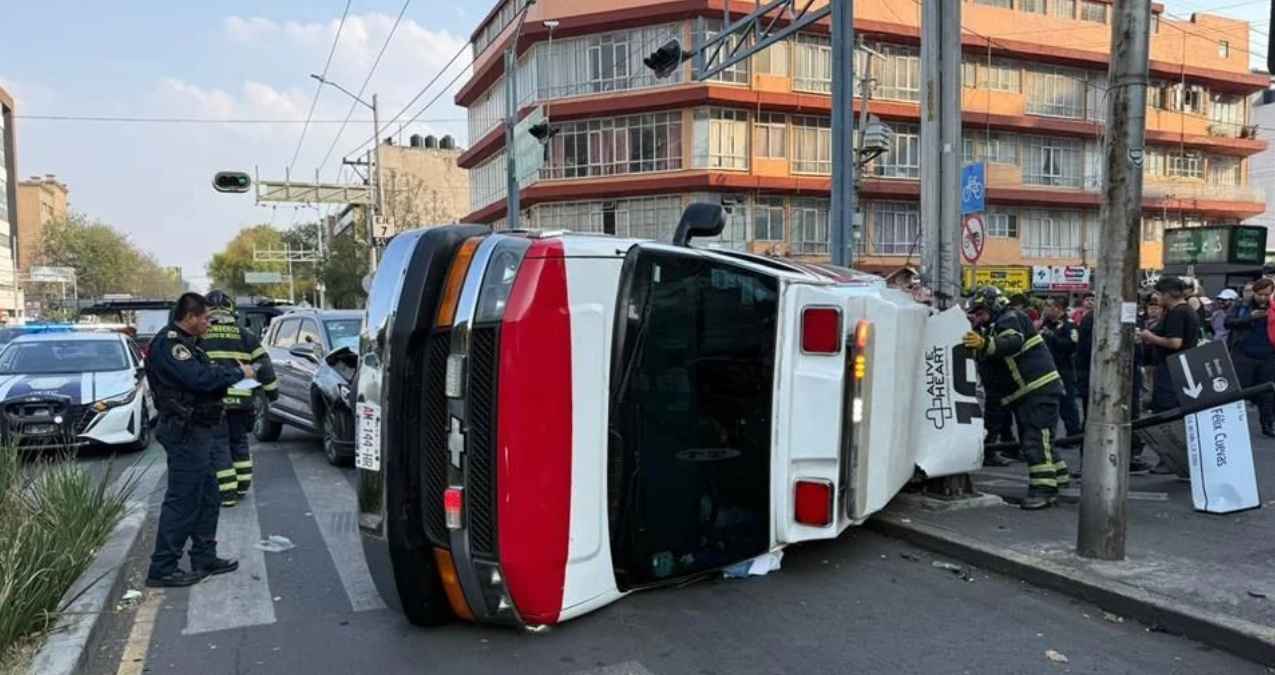 Una ambulancia particular terminó volcada sobre Avenida Félix Cuevas, en la Ciudad de México, después de impactarse con una camioneta.