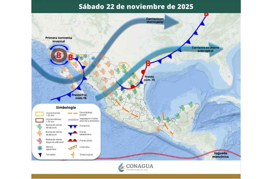 Este sábado 22 de noviembre, las bajas temperaturas y la lluvia serán protagonistas en el clima de muchas partes de México, gracias al frente frío número 16 y la primera tormenta invernal de la temporada. Según el Servicio Meteorológico Nacional (SMN), se esperan nevadas, lluvias intensas y vientos fuertes de hasta 80 km/h.