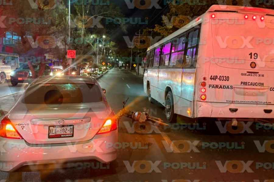 De acuerdo con las autoridades de Tránsito, en el choque participaron un Nissan V-Drive gris plata con placas de Tamaulipas, una unidad de transporte público y la motocicleta.