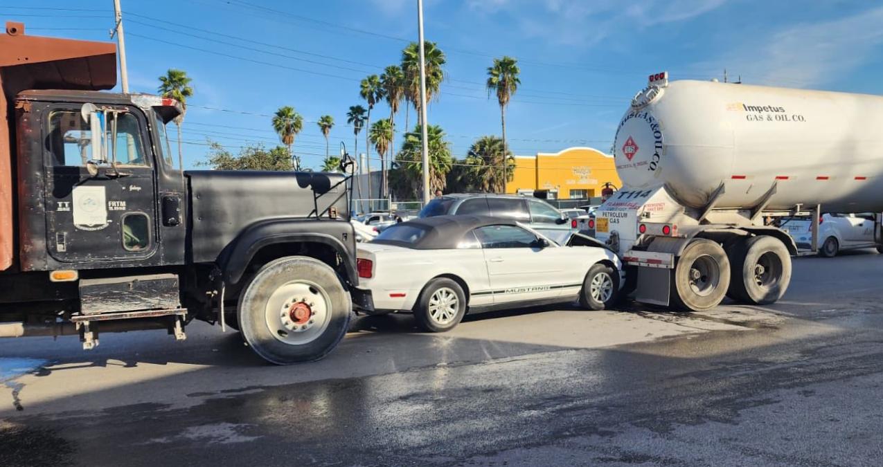 Durante la mañana de este miércoles, se registró un accidente donde un camión de volteo impactó por la parte trasera a un Mustang y lo proyectó contra una pipa de combustible en Matamoros, Tamaulipas.