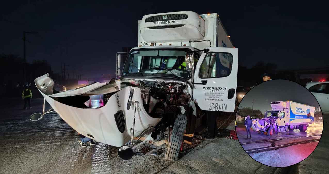 El choque ocurrió minutos antes de las 6:00 horas en el cruce de la carretera a Monclova y la vía Laredo. El vehículo transportaba productos refrigerados y, aunque terminó con severos daños, su operador presentó algunos golpes.