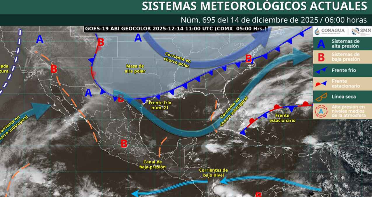 El frente frío número 21 se aproximará a la frontera norte y noreste del país durante este domingo 14 de diciembre, y de acuerdo al Sistema Meteorológico Nacional (SMN), interactuará con la corriente en chorro subtropical, provocando un clima con rachas de viento de entre 40 y 60 km/h, así como lluvias y chubascos en Coahuila, Nuevo León y Tamaulipas.