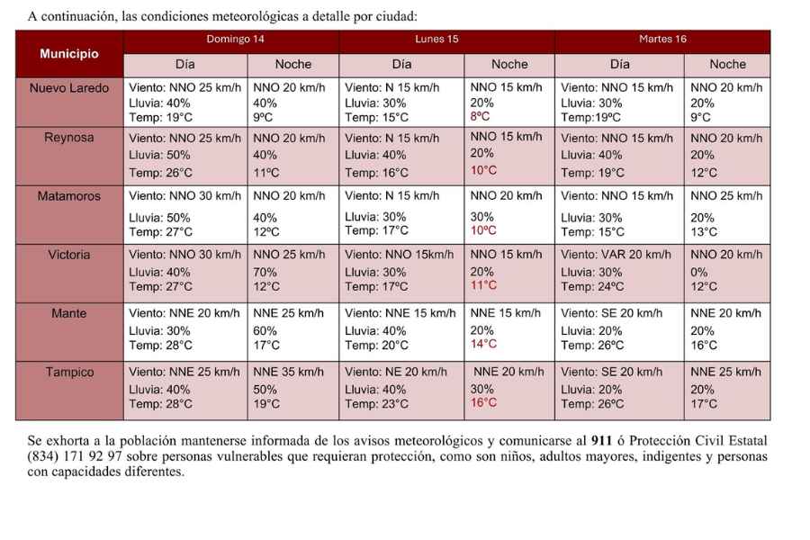 Para Tamaulipas, el pronóstico también indica temperaturas máximas de 30 a 35 °C en algunas zonas. Mientras que durante la madrugada del domingo para el lunes se esperan temperaturas mínimas de 0 a 5 °C. En áreas serranas del estado, asociadas al ingreso del aire frío.