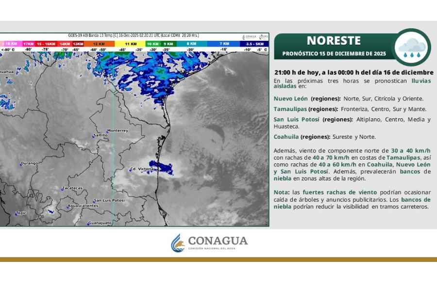 - Zona fronteriza: En municipios como Reynosa, Matamoros y Nuevo Laredo, las temperaturas oscilarán entre los 11 y 12 °C durante la mañana y entre los 26 y 28 °C durante la tarde, y entre 20 y 22 °C por la noche.