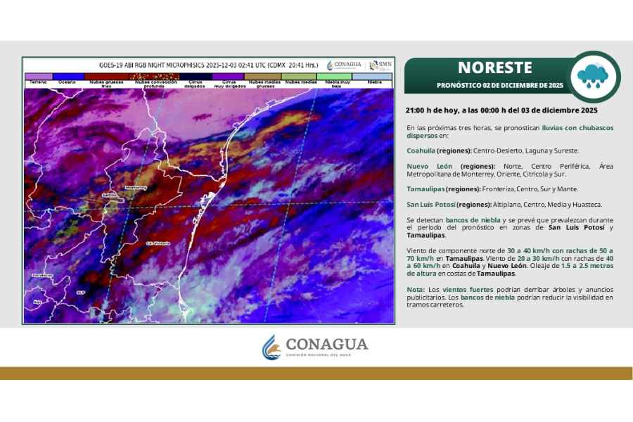 El pronóstico señala lluvias aisladas de corta duración; con acumulados —estimados— entre 0.1 y 5 mm. Es importante señalar que no habrá precipitaciones generalizadas. Aunque podrían registrarse —algunas— lloviznas pasajeras en algunos municipios por el ingreso de humedad y pequeños núcleos de inestabilidad.