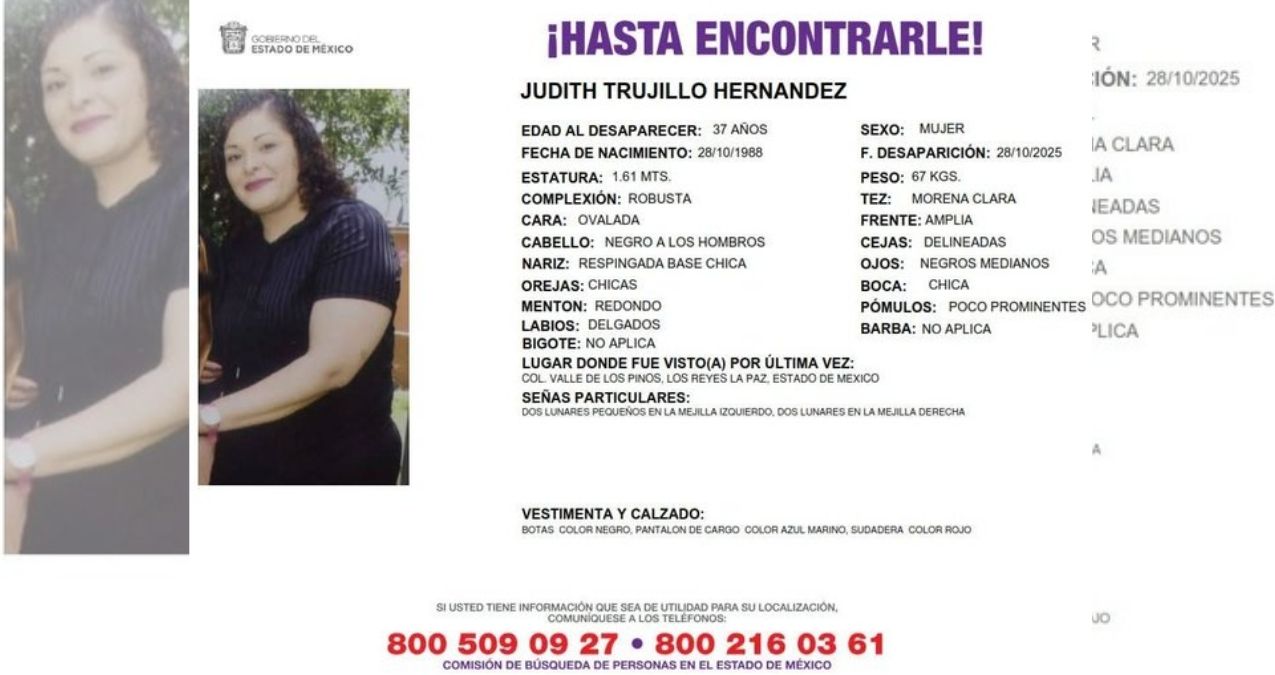 Familiares alertan posible feminicidio de Judith Trujillo en el Estado de México. Judith Trujillo Hernández, agente de Tránsito del Estado de México, fue reportada como desaparecida el pasado día 28 de octubre de 2025. Tras ser vista por última vez en la colonia Valle de Los Pinos, en Los Reyes La Paz.