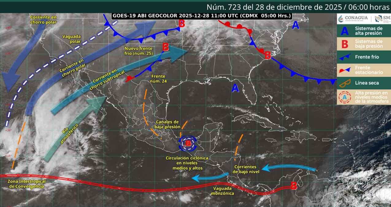 Por otra parte, un canal de baja presión y una circulación ciclónica en niveles medios y altos de la atmósfera sobre el sureste del país ocasionarán lluvias y chubascos en el oriente, sur y sureste mexicano, así como en la península de Yucatán. En estas zonas se prevén lluvias puntuales fuertes en Chiapas, en su región centro y este, y en Quintana Roo, en el centro y sur.