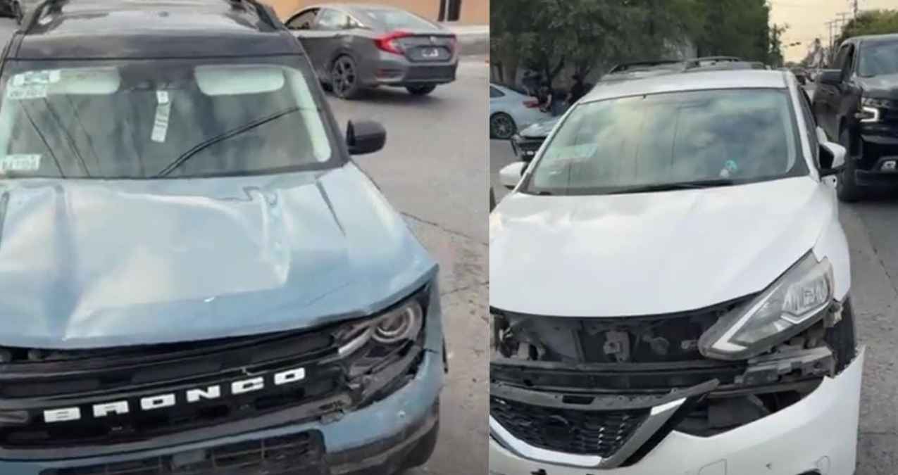 De acuerdo con informes, un vehículo Nissan Sentra se atravesó por donde circulaba una camioneta Ford tipo Bronco. La cual lo impactó por un costado, dejando al automóvil con la defensa desprendida en su totalidad.