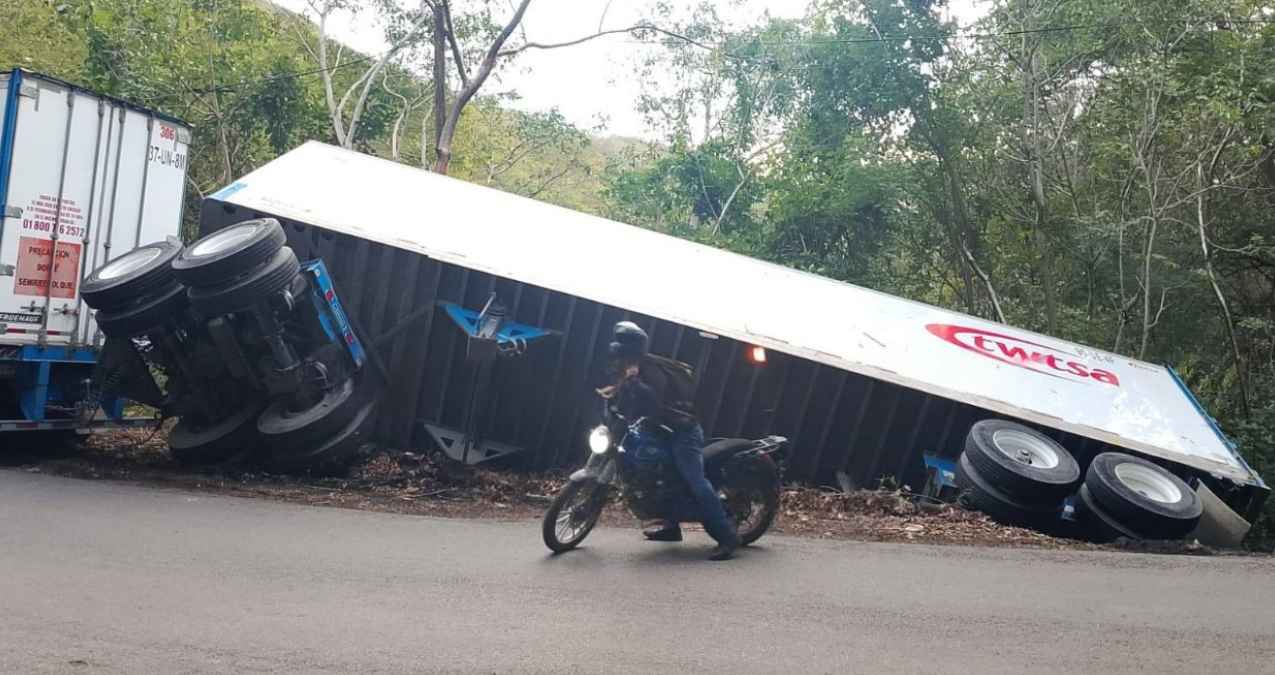 Guardia Estatal atendió el reporte de una volcadura en Ocampo, Tamaulipas. Una caja seca remolcada por un tráiler volcó sobre la carretera Mante–Ocampo, justo a la altura del mirador.