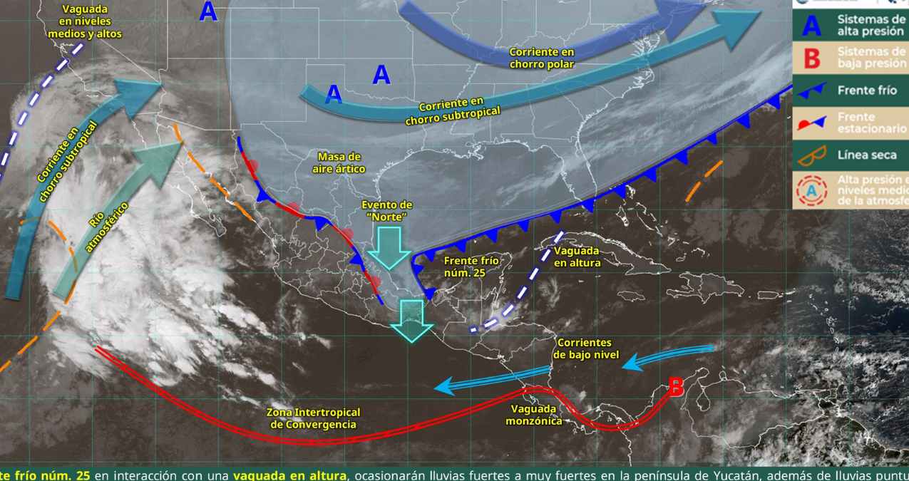 Clima hoy en México: Durante el transcurso de este martes, el frente frío núm. 25 se extenderá sobre la península de Yucatán y mantendrá interacción con una vaguada en altura. Esta combinación favorecerá lluvias fuertes a muy fuertes en esa región, además de lluvias puntuales intensas en el oriente y sureste del país, con acumulados torrenciales en zonas de Oaxaca, Veracruz y Tabasco.