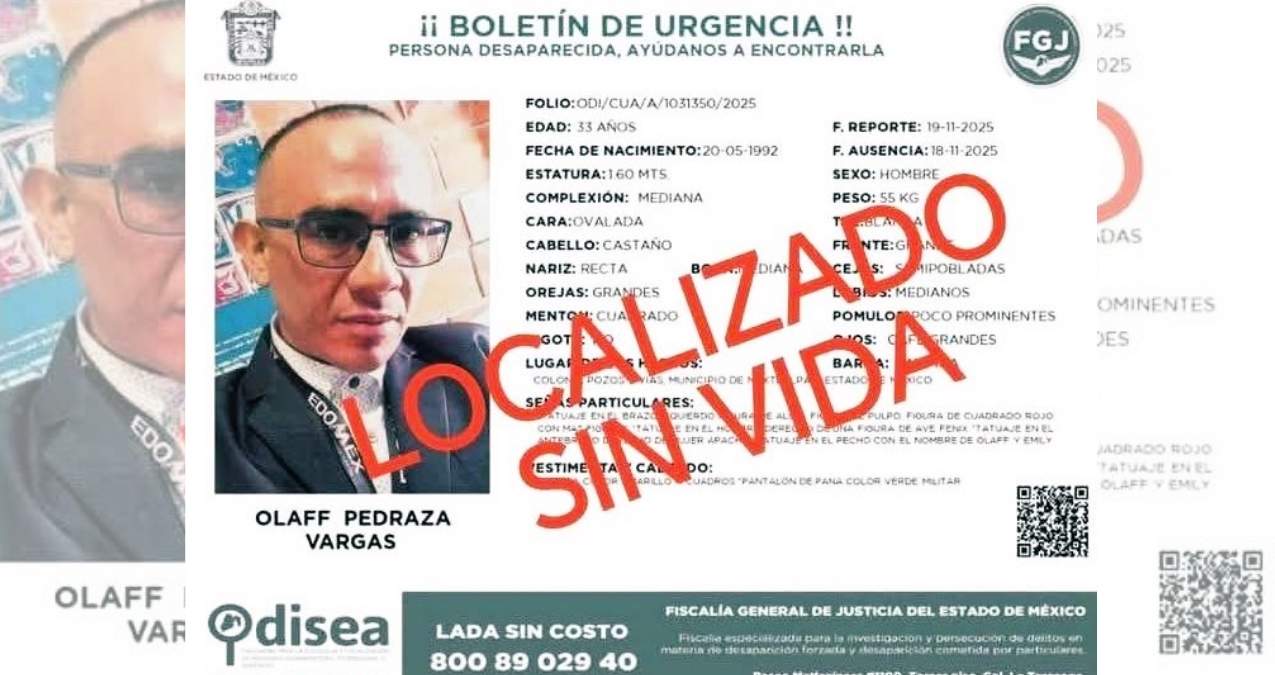 Localizan sin vida a Olaff Pedraza, desaparecido en Edomex. El hallazgo de un cuerpo dentro de un canal de desagüe en el municipio de Nextlalpan, Estado de México, generó una fuerte movilización,