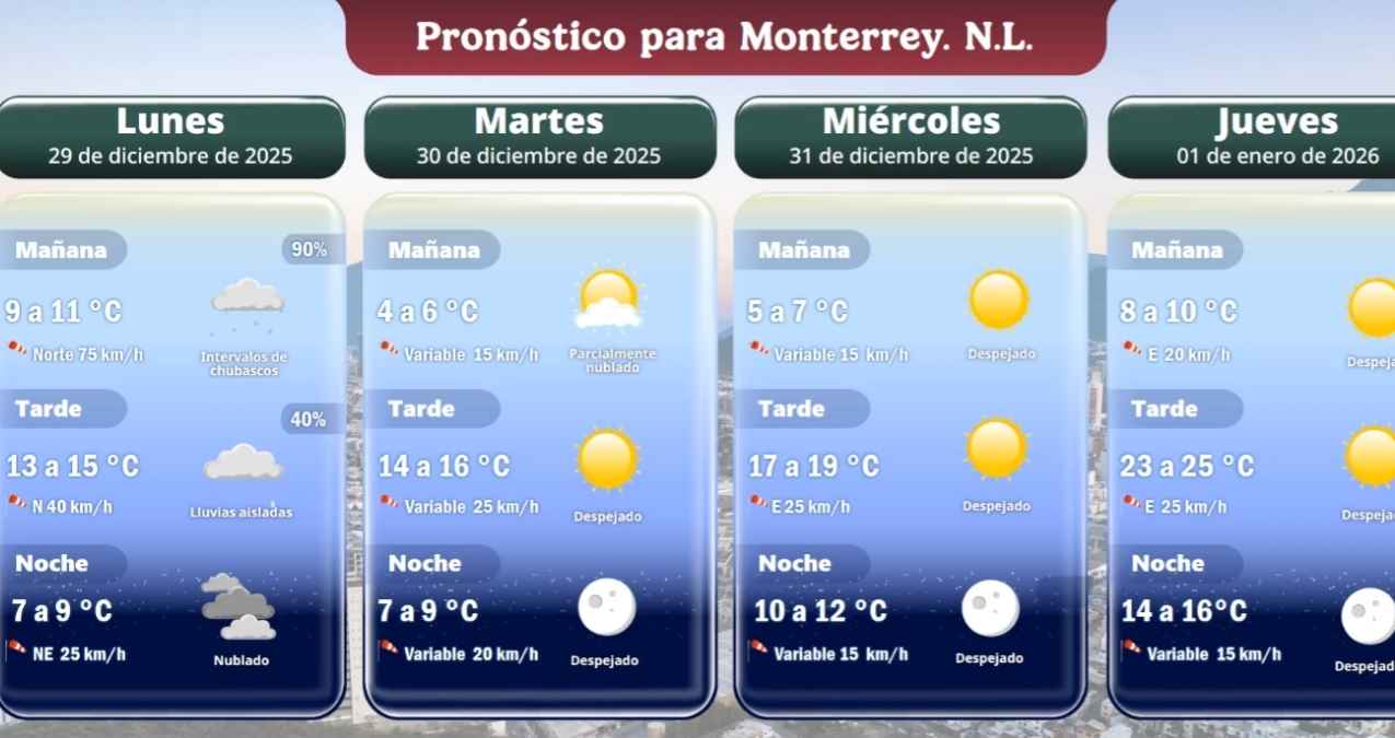 Nuevo León pronóstico del clima 31 de diciembre 2025. Por lo que si tienes planes para festejar al aire libre este fin de año; lo mejor es que prepares la chamarra. Ya que el paso del frente frío número 25 mantendrá temperaturas de un solo dígito en la región. Aunque la buena noticia es que las nubes comenzarán a ceder.