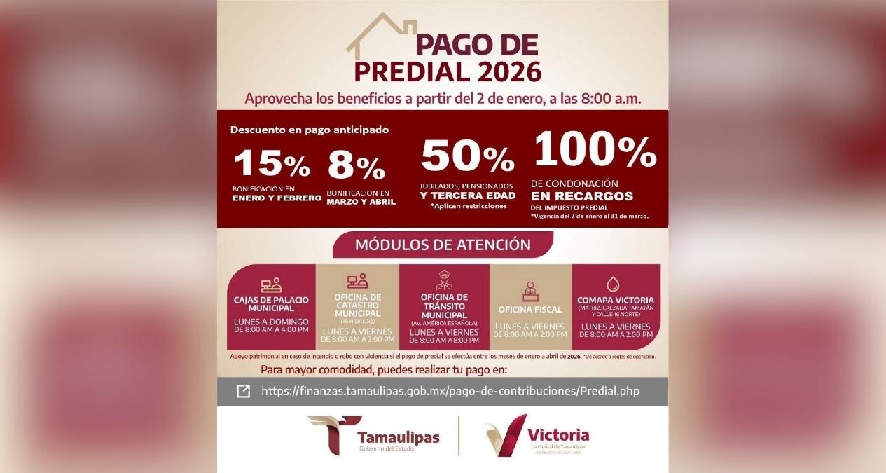 “Cumplir con el pago del Predial no solo representa una obligación ciudadana, sino una inversión directa en mejores servicios, obras públicas y atención para Victoria”, destacó el Gobierno Municipal en su mensaje a la población.