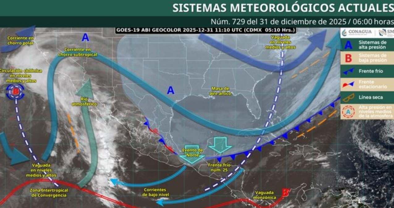 Este miércoles 31 de diciembre de 2025, el frente frío número 25 dejará de afectar directamente al país; sin embargo, la masa de aire ártico asociada seguirá influyendo en gran parte del territorio nacional.