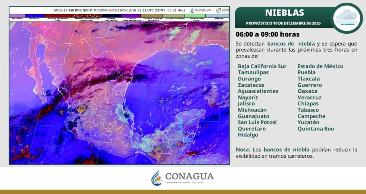 En Tamaulipas, el pronóstico indica cielo parcialmente nublado y sin lluvia. Por la mañana se espera ambiente frío con heladas en zonas altas de Veracruz y condiciones frescas a templadas en el resto del litoral, acompañado de bancos de niebla. Por la tarde, el ambiente será templado a cálido, con viento del este y noreste de 10 a 20 km/h y rachas de 30 a 50 km/h en Tamaulipas.