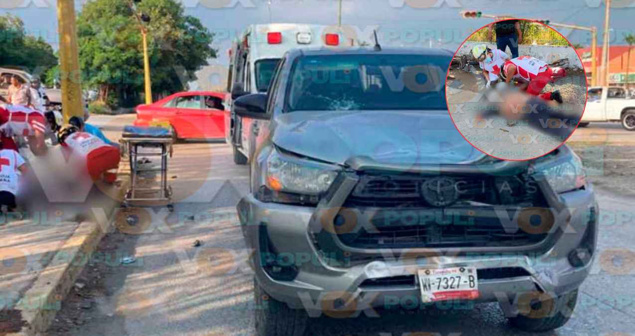 Un motociclista terminó con lesiones de consideración y al borde de la muerte luego de ser impactado por una camioneta que, según testigos, intentó ganarle el paso al semáforo sobre Eje Vial Lázaro Cárdenas y la Avenida Las Américas en Ciudad Victoria, Tamaulipas.