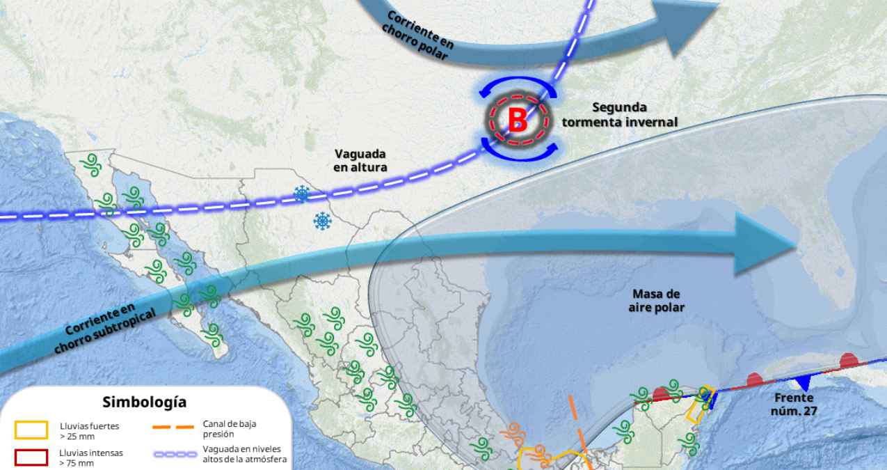 Además, se esperan intervalos de chubascos en Veracruz (Las Montañas) y lluvias aisladas en Tamaulipas. Por la mañana, el ambiente será frío a fresco, con bancos de niebla, mientras que en zonas altas de Veracruz se prevé ambiente muy frío con heladas.