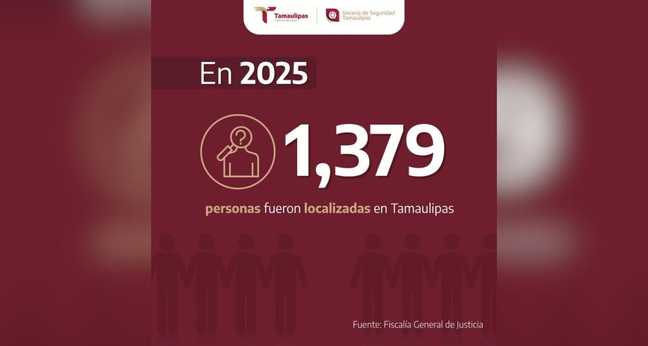 Durante el año 2025, derivado de las acciones de investigación, búsqueda e identificación de personas no localizadas y en estricto apego a los protocolos de actuación vigentes, se logró la localización de 1,379 personas que contaban con reporte de no localización en Tamaulipas.