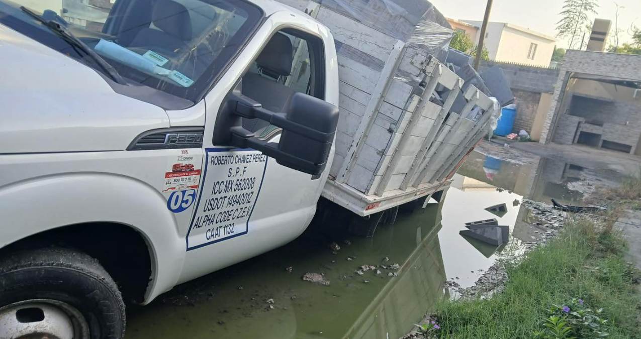 Durante la mañana de este miércoles, un camión de materiales cayó en un bache en la colonia Buenavista, en Matamoros, Tamaulipas.
