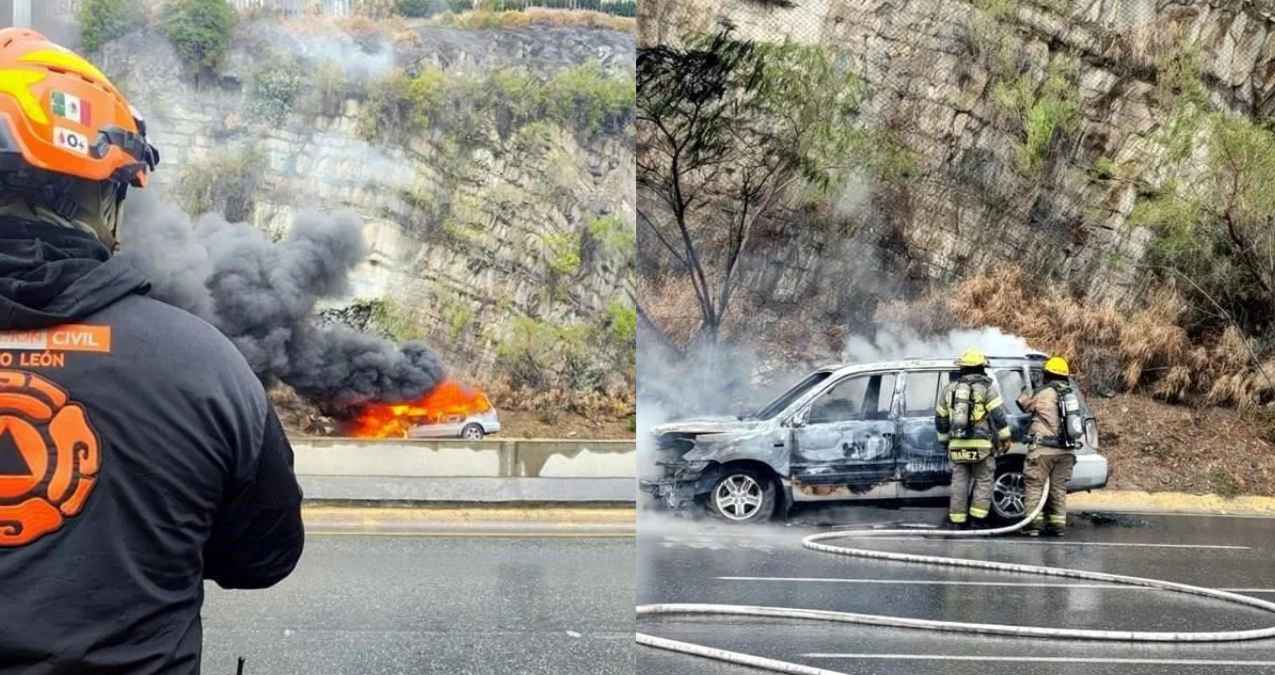 A las 9:50 horas, los testigos reportaron el incendio a la altura del monumento “La Diana Cazadora”, cerca de la Colonia Fuentes del Valle. Elementos de Rescate 911 de San Pedro, Bomberos Nuevo León y Protección Civil del Estado llegaron al lugar y encontraron una Honda Pilot blanca completamente en llamas sobre el carril derecho.