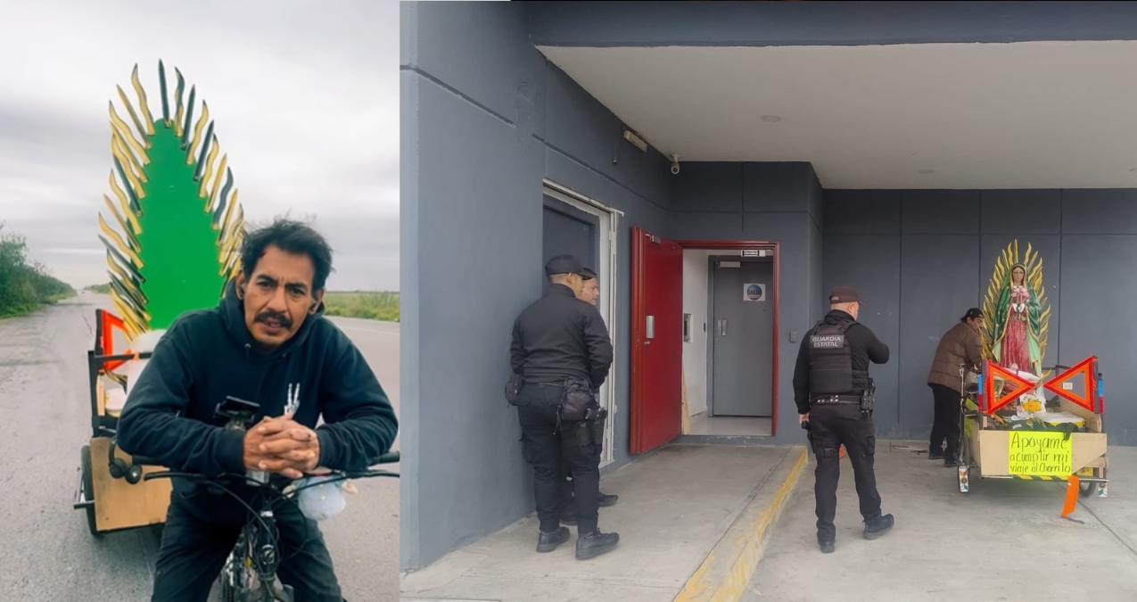Este hombre está llevando a cabo su recorrido como parte de una manda religiosa, transportando una imagen de la Virgen de Guadalupe en su bicicleta.