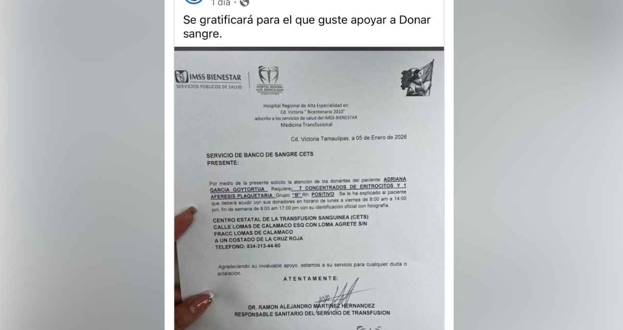 La información oficial, que también circuló ampliamente en plataformas digitales, fue emitida por el Hospital Regional de Alta Especialidad en Ciudad Victoria “Bicentenario 2010”. Adscrito a los Servicios de Salud del IMSS-BIENESTAR, a través del área de Medicina Transfusional. En el documento, fechado el 5 de enero de 2026, el Servicio de Banco de Sangre del CETS detalla que la paciente Adriana García Goytortúa requiere con urgencia siete concentrados de eritrocitos. Y una aféresis plaquetaria, del grupo B Rh positivo.