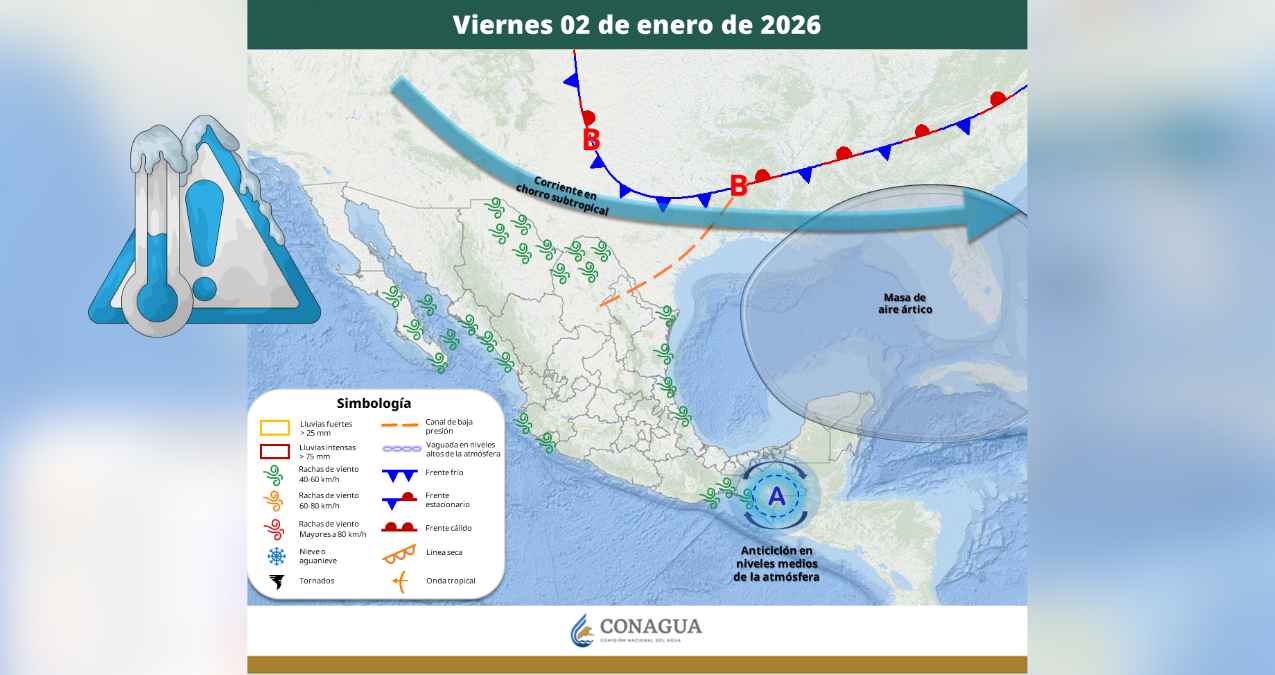 Este viernes 2 de enero, México vivirá condiciones meteorológicas contrastantes en el clima. Según el Servicio Meteorológico Nacional (SMN), se esperan lluvias fuertes en algunas zonas de Baja California, además de un ambiente frío a muy frío, con heladas en varias regiones del país.