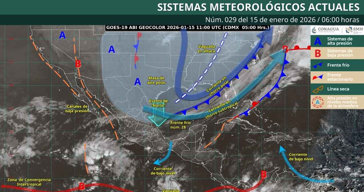 ¿Qué regiones sentirán más el Norte en el clima de México este jueves? Este 15 de enero de 2026, el frente frío número 28 avanza con rapidez por el sureste mexicano y la península de Yucatán. En su recorrido, interactúa con una vaguada en altura sobre el golfo de México, lo que provoca intervalos de chubascos y lluvias puntuales muy fuertes en ambas regiones, además de lluvias puntuales intensas en zonas de Chiapas y Tabasco.