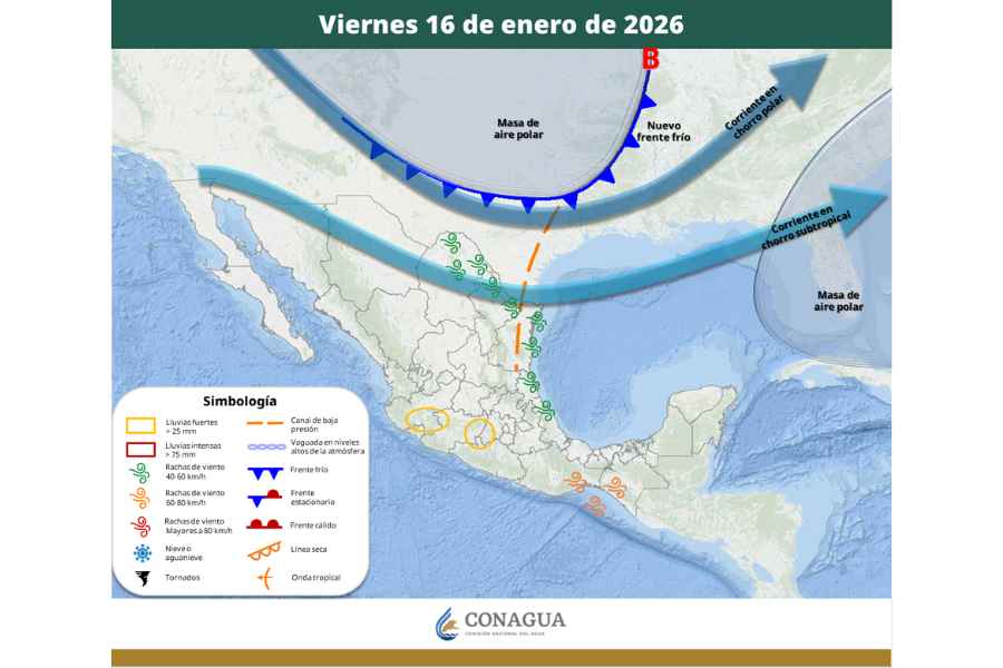 El Servicio Meteorológico Nacional (SMN) informó que para este viernes 16 de enero, el frente frío número 28 se desplazará hacia el oriente del Golfo de México, causando un clima helado en distintas zonas. Aunque, a su vez, permitirá una leve recuperación de las temperaturas en el oriente, centro y sureste del país durante la tarde. Sin embargo, se mantendrá viento de componente norte con rachas de hasta 80 km/h en el Istmo y Golfo de Tehuantepec. Además, se espera la llegada de un nuevo frente frío (número 29) que afectará el norte y noreste de México, trayendo fuertes rachas de viento y posibles tolvaneras.