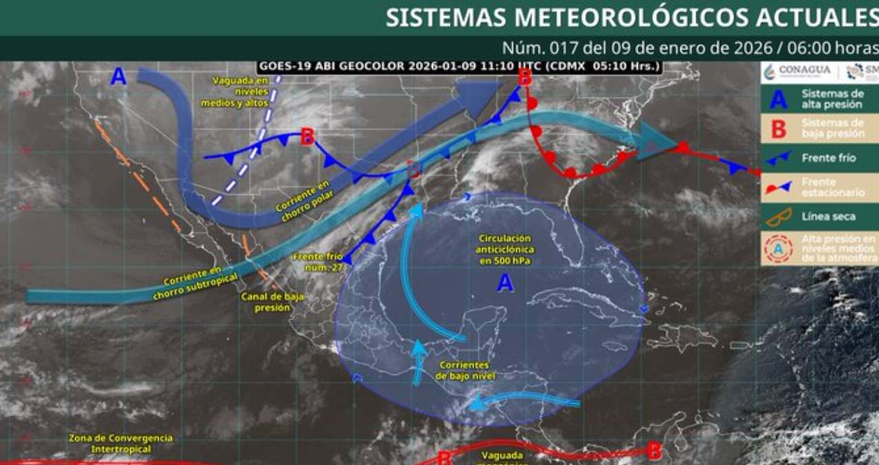 Este viernes 9 de enero de 2026, el Frente Frío núm. 27 se mantiene sobre el noreste del país. En combinación con la corriente en chorro subtropical, se esperan lluvias y chubascos en Nuevo León, Tamaulipas y San Luis Potosí, además de viento con rachas de 30 a 50 km/h en Coahuila, Nuevo León, Tamaulipas y Veracruz.