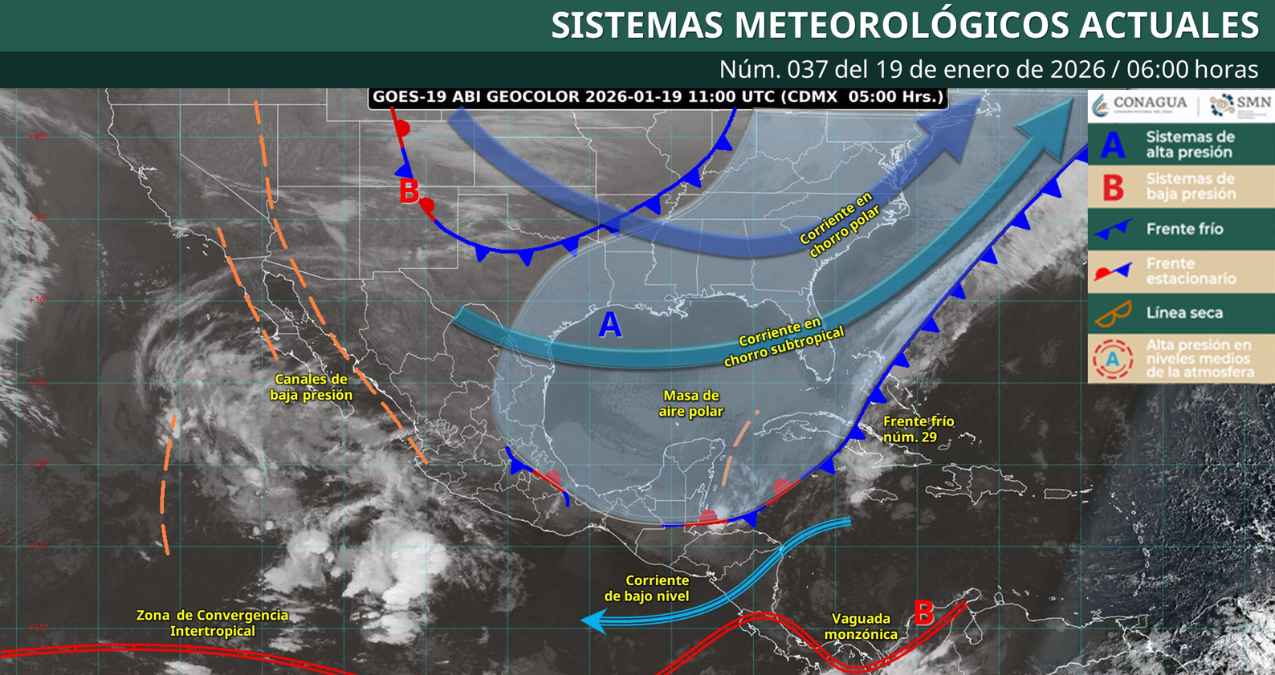 ¿Hasta cuándo afectará el frente frío 29 a varias regiones del país? Este lunes 19 de enero de 2026, el frente frío número 29 se desplazará sobre el mar Caribe sin afectar directamente al territorio nacional. No obstante, su masa de aire polar cubrirá el golfo de México y provocará condiciones relevantes en varias regiones del país.