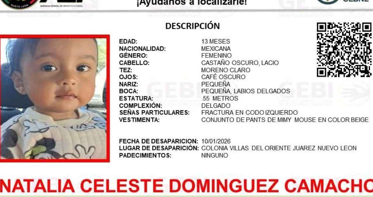 Las autoridades de Nuevo León activaron una Alerta Amber para encontrar a Natalia Celeste Domínguez Camacho, una bebé de solo un año de edad que fue reportada como desaparecida en el municipio de Juárez. La última vez que vieron a la menor fue el 10 de enero de 2026 en la colonia Villas del Oriente, después de que una mujer identificada como Jimena Martínez la dejara bajo su cuidado. Ella tiene aproximadamente 1.60 metros de estatura, tez apiñonada, cabello rizado y complexión robusta.