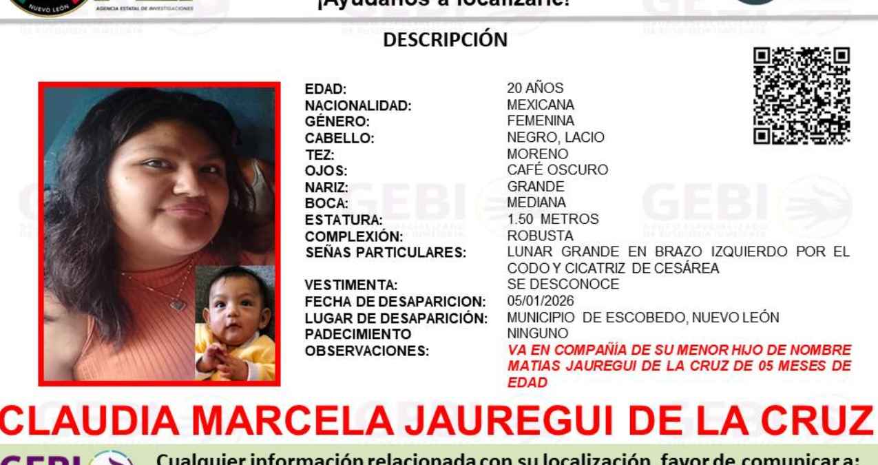 La Fiscalía General de Justicia de Nuevo León solicita la colaboración de la ciudadanía para localizar a Claudia Marcela Jauregui de la Cruz, una joven mujer de 20 años que desapareció junto a su hijo es Escobedo.