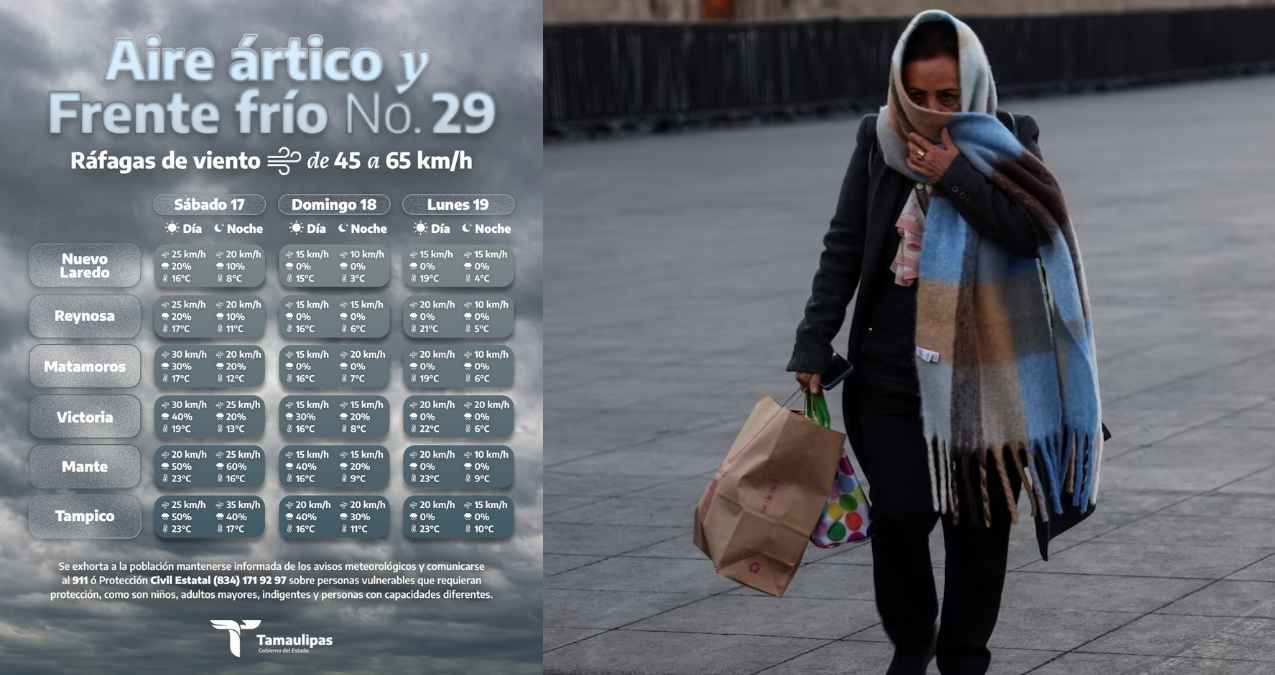 Si tiene planes para este fin de semana en Tamaulipas, mejor vaya preparando el abrigo. La Coordinación Estatal de Protección Civil, con información del Servicio Meteorológico Nacional, ha emitido un pronóstico detallado sobre el ingreso del frente frío No. 29, impulsado por una masa de aire ártico que comenzará a sentirse con fuerza a partir de este sábado.