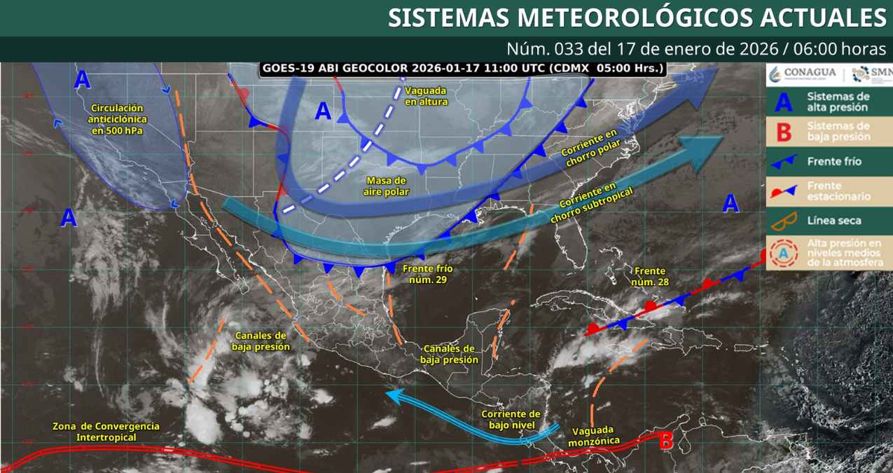 Se prevé evento de “Norte” de 30 a 50 km/h con rachas de 60 a 80 km/h en Tamaulipas y Veracruz durante la tarde, extendiéndose por la noche al istmo y golfo de Tehuantepec por el Frente frío 29 en México. Además, se espera oleaje de 3.0 a 4.0 metros en las costas de Tamaulipas, Veracruz y el golfo de Tehuantepec.