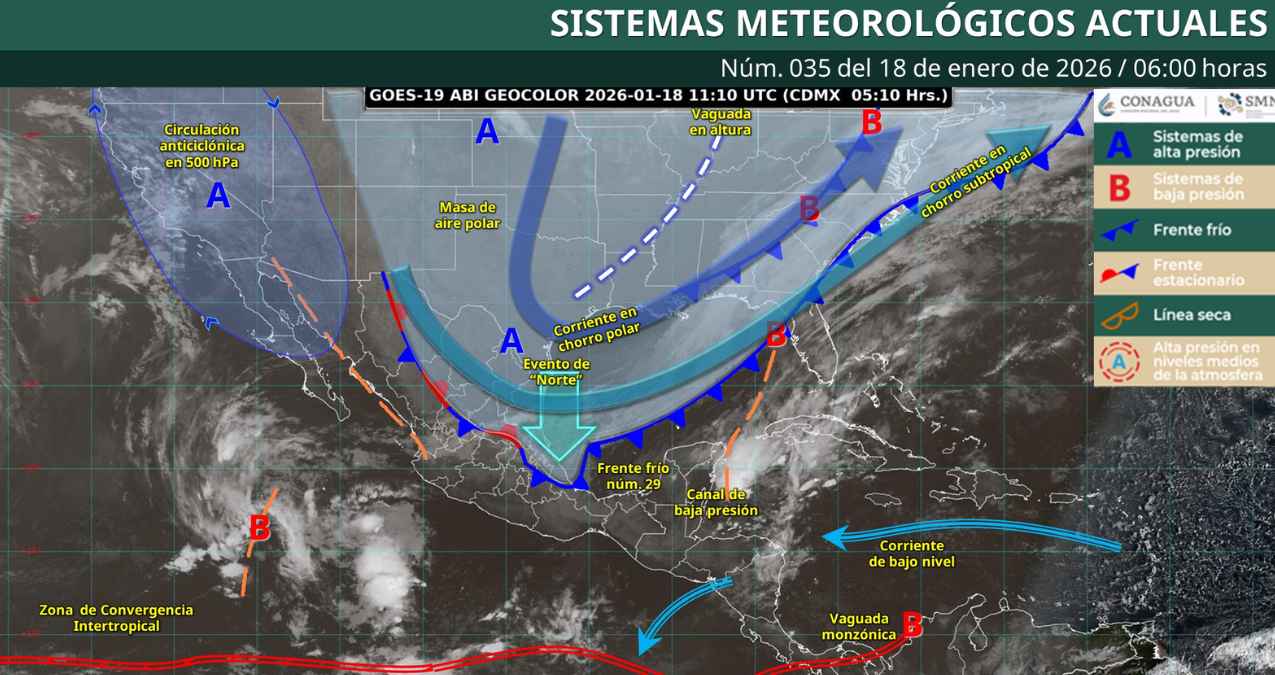 ¿En qué estados el frente frío 29 traerá más rachas de viento? Para este domingo 18 de enero de 2026, el frente frío núm. 29 se desplazará sobre el oriente del golfo de México, la península de Yucatán y el sureste del país. Este sistema mantendrá condiciones de lluvias puntuales intensas en Veracruz, Tabasco, Oaxaca y Chiapas, además de lluvias muy fuertes en Puebla y fuertes en Hidalgo, Campeche y Quintana Roo. En Yucatán se esperan chubascos.