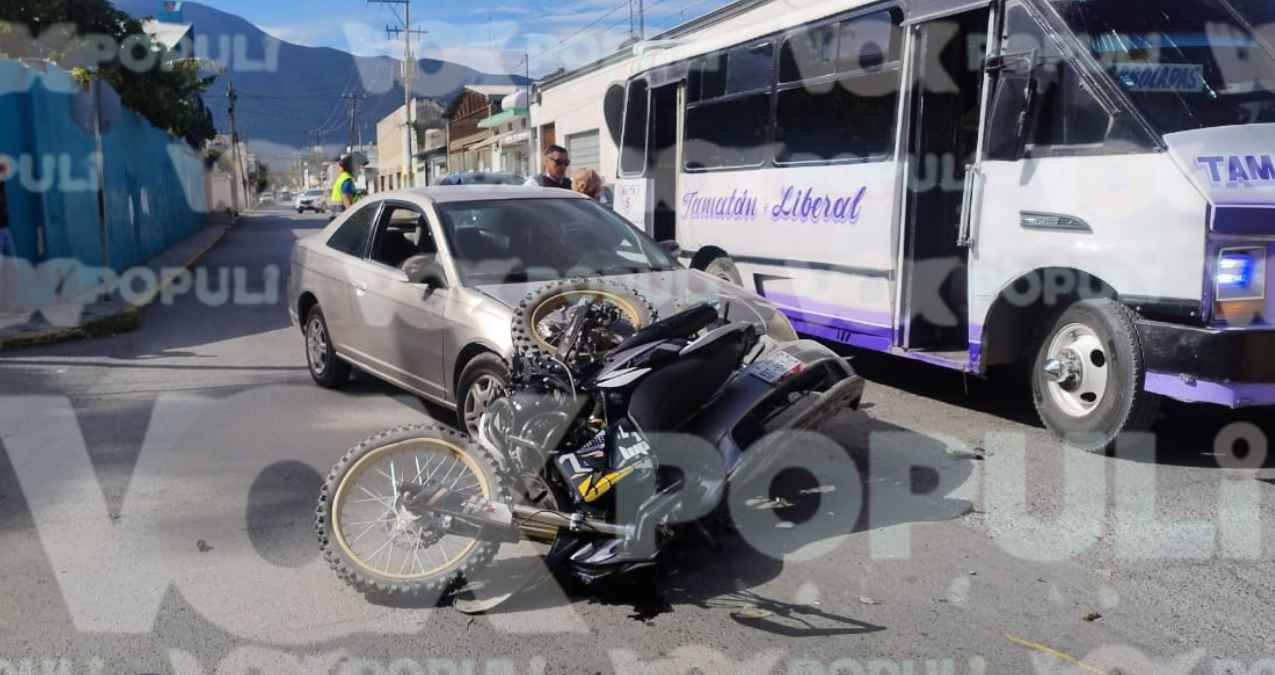 Esto provocó que cerrara el paso a un motociclista que circulaba de sur a norte, con preferencia de paso. El impacto ocurrió en el costado delantero derecho del automóvil, dejando la motocicleta incrustada en la fascia del vehículo.