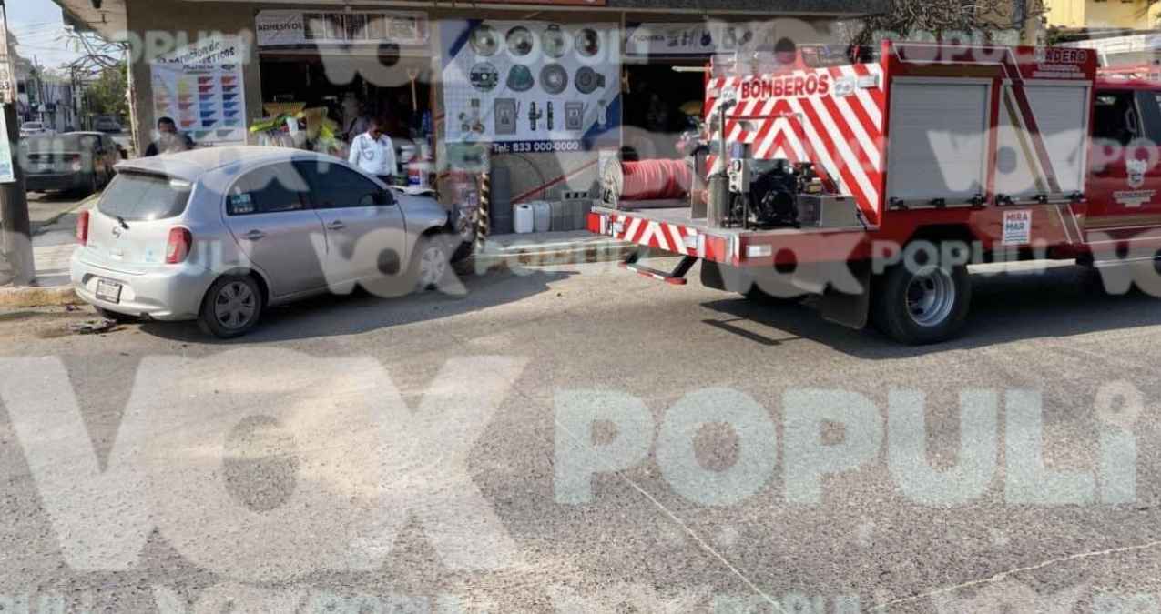 De acuerdo con lo observado en el lugar, un Nissan March color blanco impactó a otro del mismo modelo, pero en color gris. Tras el golpe, este último se proyectó contra los postes de contención de una ferretería.
