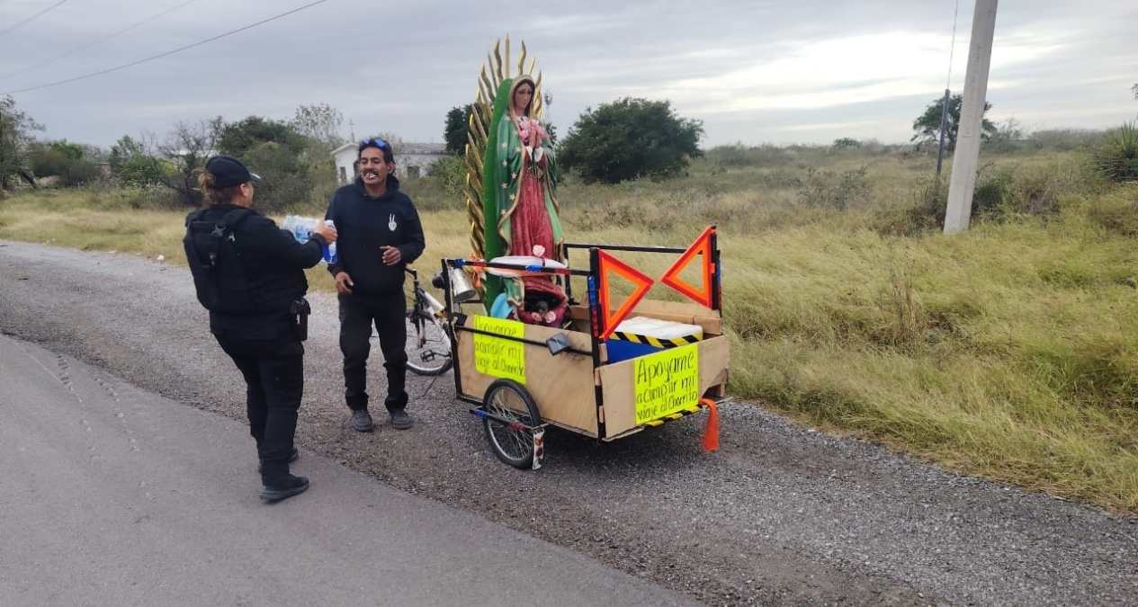 Cumpliendo una manda religiosa, un ciclista residente del municipio de Reynosa partió con rumbo a El Chorrito a bordo de una bicicleta tricarga. Traslada una figura de la Virgen de Guadalupe, mientras la Guardia Estatal ofrece seguridad al peregrino durante su recorrido.