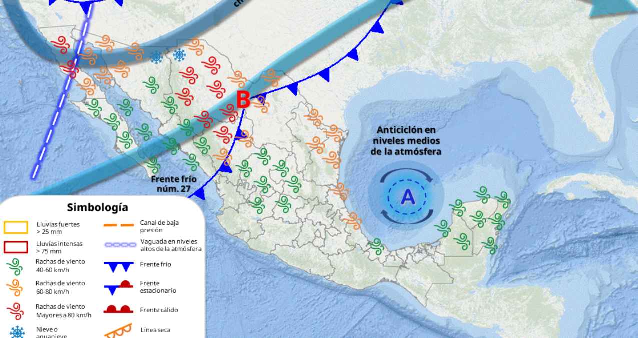 Viento de 10 a 20 km/h con rachas de 30 a 50 km/h: Baja California Sur, Sinaloa, Zacatecas, San Luis Potosí, Aguascalientes, Jalisco, Guanajuato, Campeche, Yucatán y Quintana Roo.