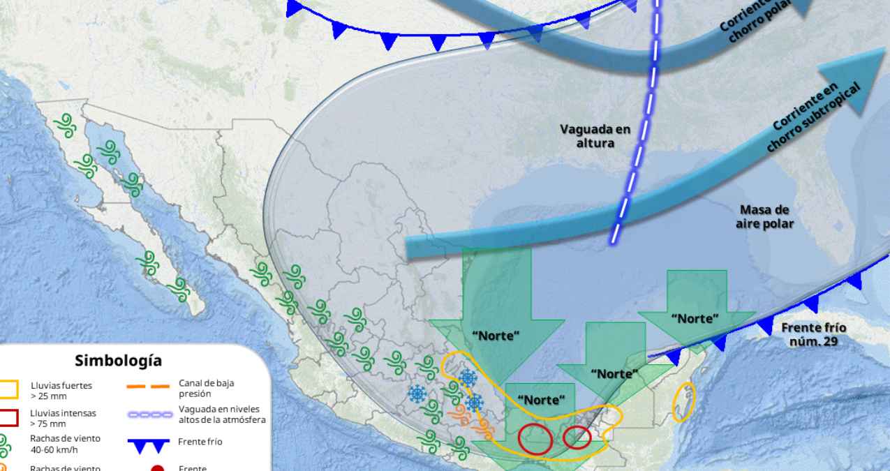 El frente frío 29 se moverá con rapidez sobre el oriente y sureste del país, así como la península de Yucatán. A su paso, provocará lluvias muy fuertes a puntuales intensas en zonas de Puebla, Veracruz, Oaxaca, Chiapas y Tabasco; lluvias fuertes en Hidalgo, Campeche y Quintana Roo; y chubascos en Yucatán.