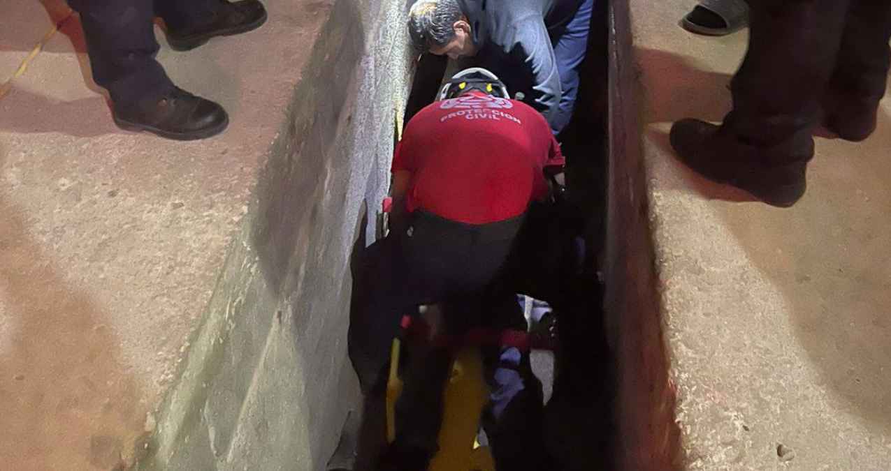 Ante lo registrado, elementos de Protección Civil y Bomberos acudieron al sitio y realizaron las maniobras necesarias para rescatar al masculino. Debido a la profundidad del área, fue necesario utilizar una canastilla especial para poder extraerlo de forma segura.