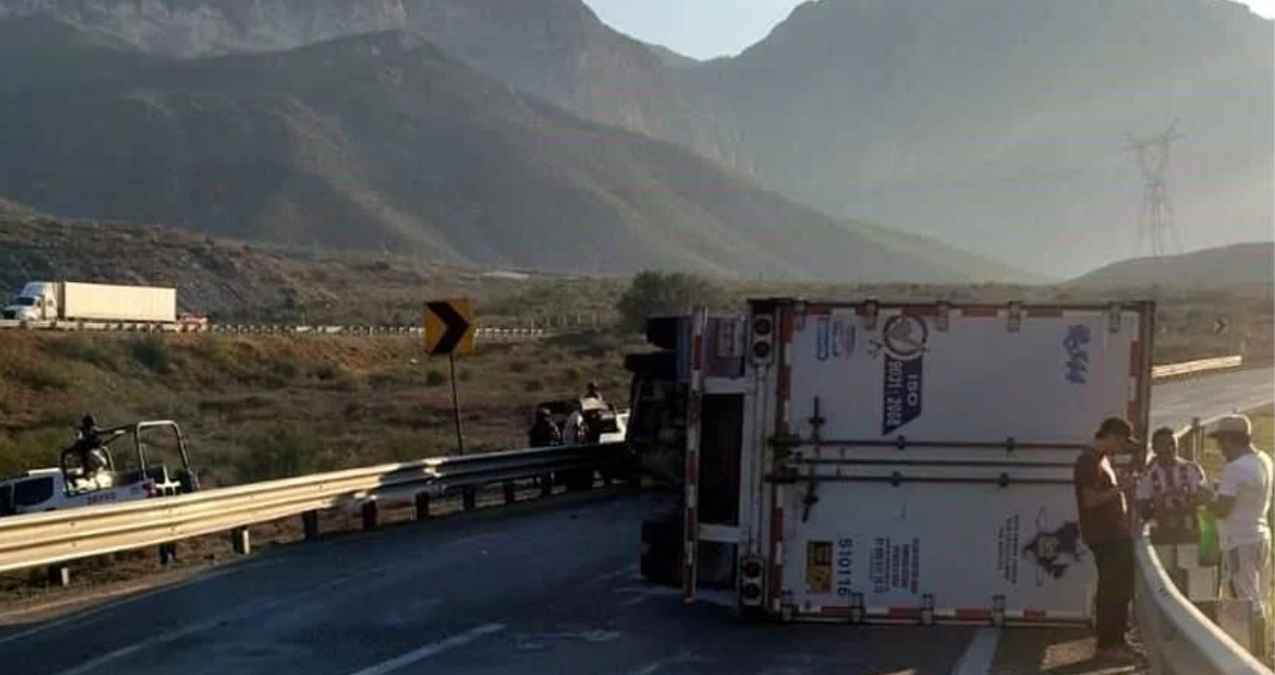 Una mujer sufrió la amputación del pie izquierdo luego de la volcadura de un tráiler en el que viajaba como acompañante, sobre la Carretera a Saltillo, a la altura del Municipio de García, Nuevo León, la tarde de este lunes.