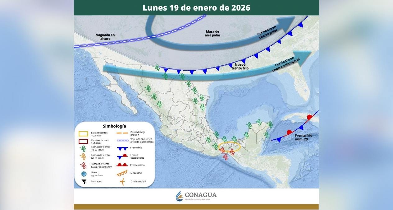 A la par del pronóstico local, la Comisión Nacional del Agua (Conagua) reportó que, del lunes 19 al miércoles 21 de enero, Tamaulipas estará bajo la influencia de sistemas frontales. Por ello, se esperan intervalos de chubascos, rachas de viento y un ambiente fresco a frío en zonas serranas durante las madrugadas.