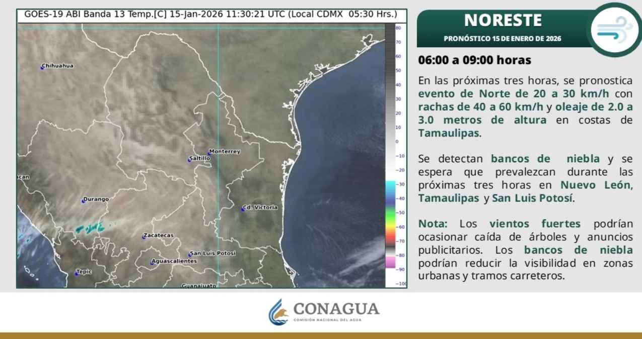 Durante la mañana, el ambiente será fresco, con condiciones de frío a muy frío en zonas altas. Por la tarde, se prevé un ambiente fresco a templado. El evento de Norte persistirá con velocidades de 40 a 50 km/h y rachas de 60 a 80 km/h en las costas de Veracruz, así como de 20 a 30 km/h con rachas de 40 a 60 km/h en las costas de Tamaulipas y Tabasco. El oleaje se mantendrá de 2.0 a 3.0 metros en la región.
